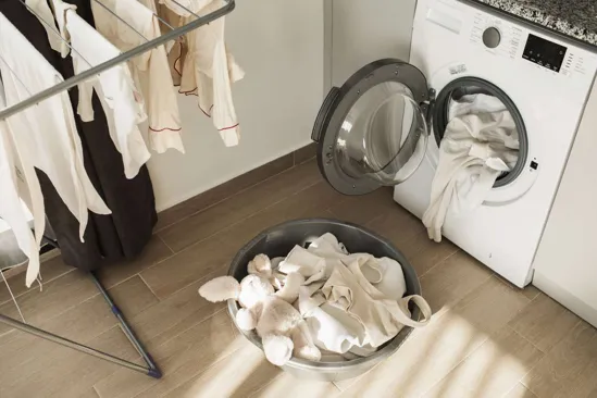 • جدا کردن لباسهای سفید: لباسهای سفید را همیشه جدا از لباسهای رنگی بشویید. این کار از رنگ گرفتن لباسهای سفید جلوگیری میکند. حتی لباسهای روشن را هم جداگانه بشویید، چون ممکن است رنگ آنها به مرور زمان روی لباسهای سفید تأثیر بگذارد.